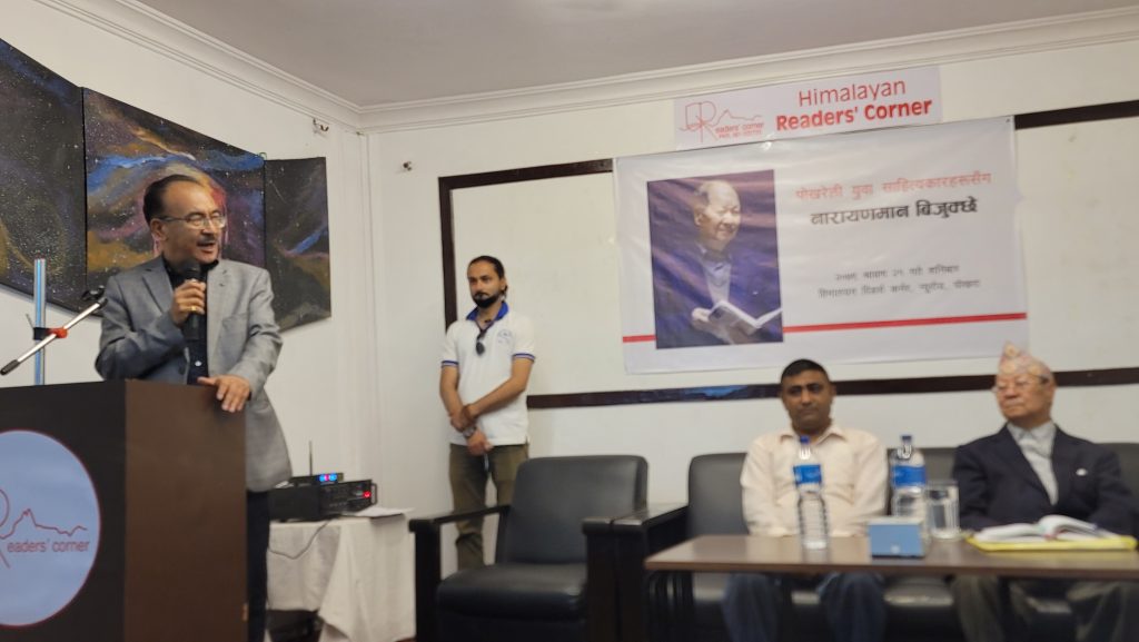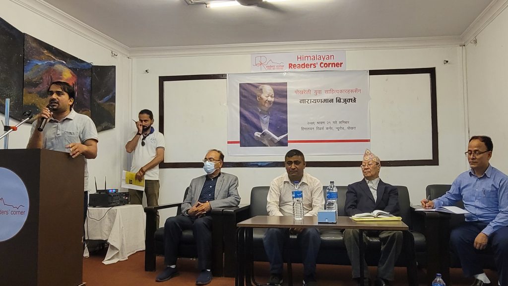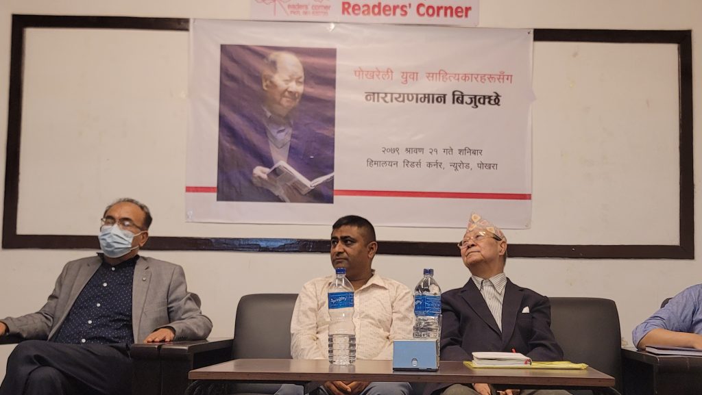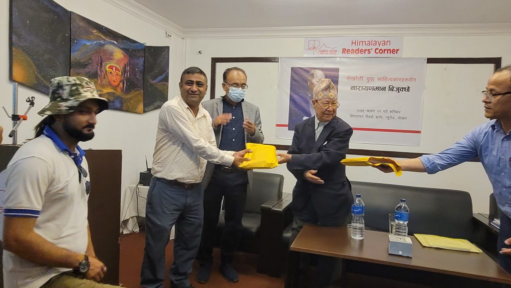 पोखराका युवा साहित्यकारहरु बिच नेता नारायणमान बिजुक्छेको साक्षात्कार तथा अन्तरकृया कार्यक्रम सम्पन्न भएको छ । नेपाल मजदुर किसान पार्टिका अध्यक्ष बिजुक्छे एक राजनैतिक नेता मात्र नभएर साहित्यकार पनि हुन । साहित्य तर्फ हरिवहादुर श्रेष्ठको नाममा आउने उनका साहित्य रचना प्रगतीशिल र देशभक्तीका हुने गर्दछन । पोखरा न्युरोडको हिमालयन रिर्डस र्कनरमा आयोजित एक समारोहमा भएको सो कार्यक्रममा सञ्जिव पौडेलले स्वागत मन्तब्य दिएका थिए भने बिशेष अतिथी कवी तिर्थ श्रेष्ठले नेता नारायणमान बिजुक्छेको साहित्यिक योगदानबारे चर्चा गरेका थिए । राजनिती र साहित्यको सम्बन्ध एवं समाजमा पार्ने प्रभावबारे नेता नारायणमान बिजुक्छले स्पस्ट पारेका थिए । पोखराका साहित्यकारहरु र साहित्य प्रति रुचिहुनेहरुको राम्रो उपस्थिती रहेको सो कार्यक्रममा युवा साहित्यकार सुरज उपाध्यको सभापतित्वमा भएको थियो । साक्षात्कार कार्यक्रमको सञ्चालन अर्का पोखरेली युवा साहित्यकार प्रान्जल अर्थात सन्जय न्यौपानेले गरेका थिए ।