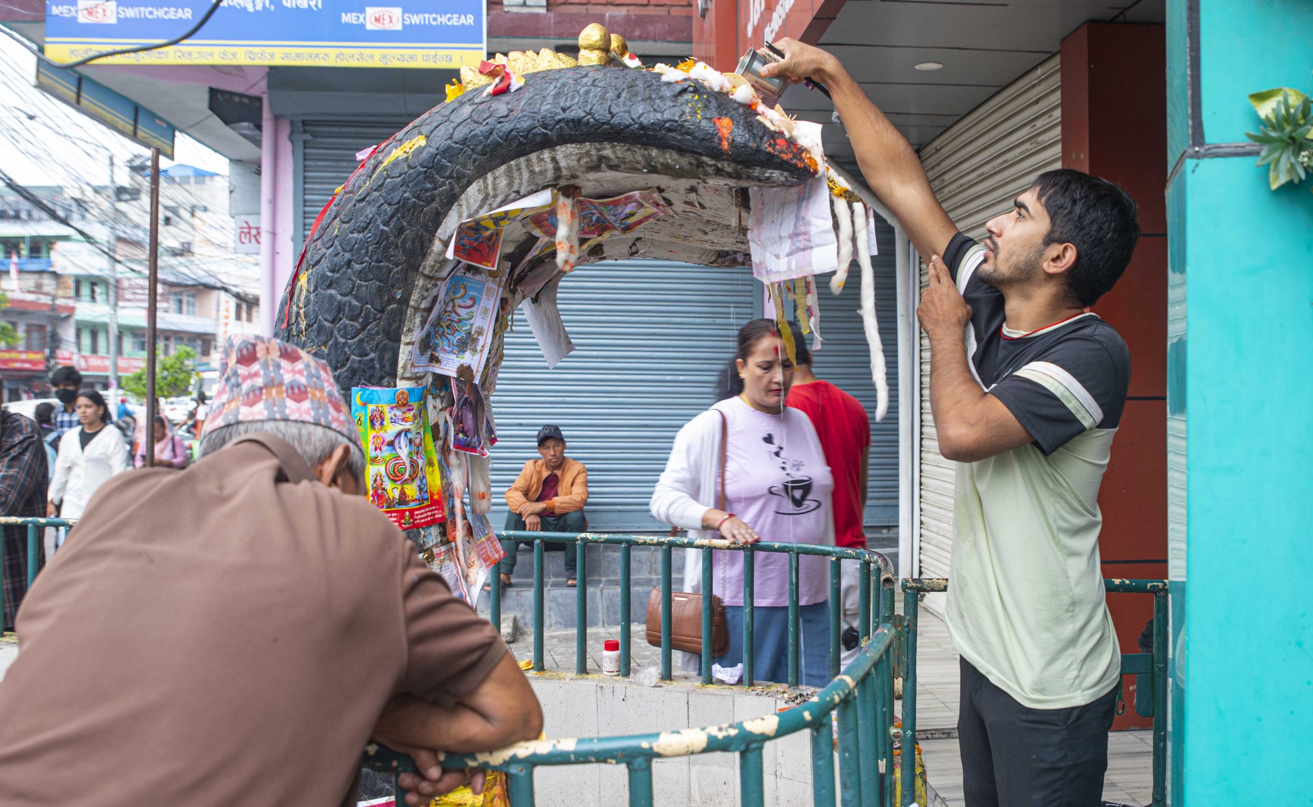 ।आजको दिन सरीसृप अर्थात् घस्रेर जमिनमा हिँड्ने जनावरहरूको पूजा अर्चना गरिने दिन हो । नागहरू अकिंत चित्र लिएर ब्राह्मण पुरोहितहरूआ९आफ्नो जजमानको घरमा दैलोमा गाइको गोबर, दूबो लिएर नाग टाँस्न पुग्दछन् । यसरी दैलो या मूल खाँबोमा टाँसिएको नागको चित्रले वर्षभरि रक्षा गर्ने जनविश्वास छ, रक्षार्थ टाँसिने यस्ता चित्रहरू ल्याउने र टाँस्ने पुरोहितहरूलाई जजमानले दक्ष अनुसारको दक्षिणा, नैवेद्य र भोजन पनि गराउने चलन छ ।