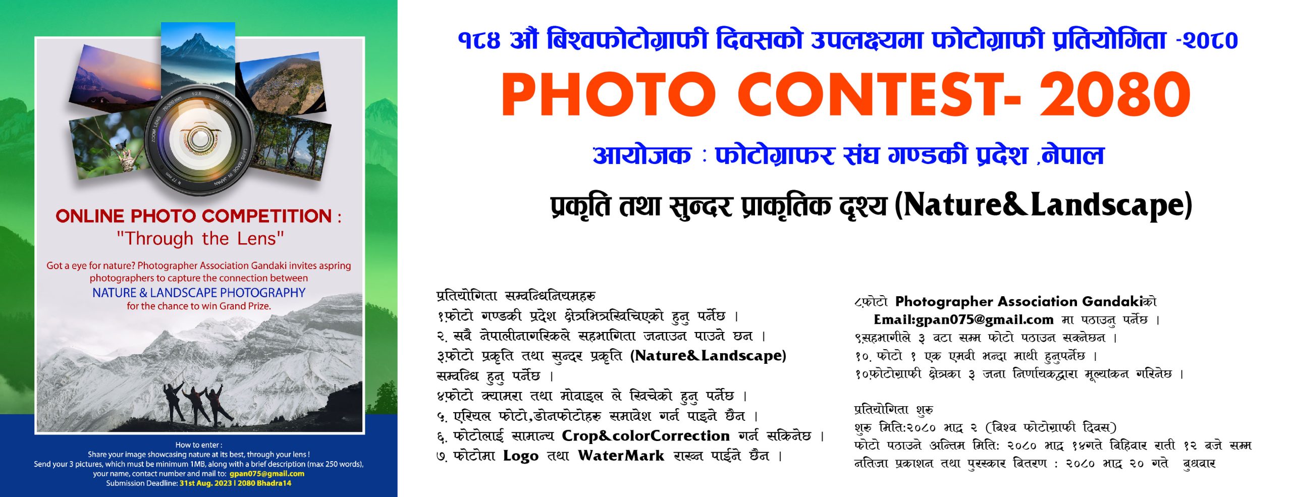१८४औं बिश्व फोटोग्राफी दिवसको अवसर पारेर फोटोग्राफर संघ गण्डकी द्वारा बिभिन्न विधामा फोटो प्रतियोगिताको घोषणा गरेको छ । संघ ले फोटोग्राफरहरुको सम्मान प्रविधिको ज्ञान, व्यवसायिहरुलाई उत्साह र फोटोग्राफरहरुको मनोवल उच्च प्रदान गर्ने उदेश्यले उक्त प्रतियोगिताको घोष्णा गरेको हो । फोटोग्राफर संघ गण्डकी को स्थापना दिवस भाद्र २० गते समापन गरिने प्रतियोगितामा मिराज राष्ट्रिय बैवाहिक फोटो प्र्रतियोगिता अन्र्तगत बिभिन्न ६ ओटा विधा सार्वजनिक गरेको छ । बेष्ट फोटो अवार्ड, ब्राईड एण्ड ग्रुम हेड सट,बेष्ट कलरिङ एण्ड रिटचिङ, बेष्ट मोमेन्ट क्याप्चरिङ, बेष्ट कपल पोजिङ, बेष्ट कल्चर गरी ६ ओटा बिधा रहेका छन । बेष्ट बैवाहिक फोटो अवार्डका लागी रु १५,५५५ नगद ट्रफी र प्रमाण पत्र रहेको छ भने अन्य बिधामा ट्रफी र प्रमाण रहेका छन् । मिराज राष्ट्रिय बैवाहिक फोटो प्र्रतियोगिता बर्ष भरिनै चलिरहेको र प्रत्यक महिनाका उत्कृष्ट प्रतियोगितालाई प्रमाण पत्रले सम्मान गरिने प्रतियोगिताका संयोजक भक्त तामाङले जानकारी दिए । मिराज राष्ट्रिय बैवाहिक फोटो प्र्रतियोगिताका लागी मिराज फोटोका संचालक भक्त तामाङ÷बृहस तामाङले रु २ लाखको अक्षयकोषको स्थापना गरेको कुरा कोषाध्यक्ष जीवन ढुङ्गानाले बताएका छन् । यसैगरी संस्थाले गण्डकी प्रदेशलाई बिश्वभरी नै चिनाउने उद्येश्यका साथ यहाँका प्राकृतिक छटाहरुलाई उजागर गर्ने र आन्तरिक पर्यटनलाई प्रोत्साहन गर्नका लागी नेचर एण्ड ल्याण्डस्केप बिधामा पनि प्रतियोगिताका घोषणा गरेको छ ।