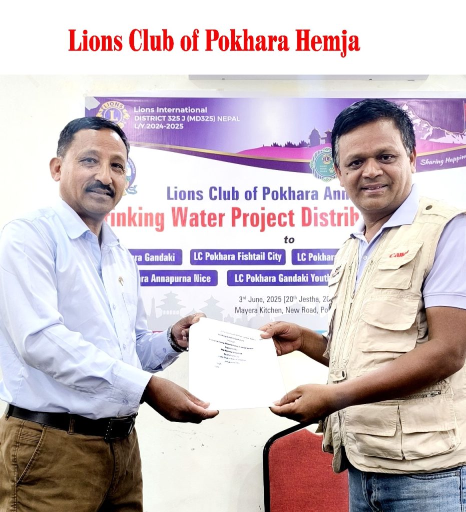 लायन्स क्लब पोखरा अन्नपूर्ण द्धारा बिभिन्न ८ वटा क्लबलाई लायन बर्ष २०२५ ÷२०२६ बिभिन्न बिद्यालयमा खानेपानी टंकी निर्माणको लागि सहमति पत्र हस्तातरण गर्ने काम सम्पन्न भयो । उक्त पत्रमा लायन्स क्लब पोखरा अन्नपूर्णका अध्यक्ष गणेश छबिले लायन्स क्लब पोखरा हेमजा, लायन्स क्लब पोखरा समृद्धि, लायन्स क्लब फिष्टेल सिटी, लायन्स क्लब पोखरा गण्डकी, लायन्स क्लब पोखरा अन्नपूर्ण नाइस, लायन्स क्लब पोखरा गण्डकी यूथ, लायन्स क्लब पोखरा अन्नपूर्ण र लियो क्लब पोखरा अन्नपूर्ण का अध्यक्षहरुलाई सहमति पत्र प्रदान गर्नु भयो । सो अवसरमा परियोजना निर्देशक सोनाम साङपोले सन २०१७ देखि संचालन थालनी भएको यो कार्यक्रम आज सम्म पोखरा वरिपरि ४८ वटा बिद्यालयमा यो परियोजना सम्पन्न भई सकेको आजको परियोजना अन्नपूर्ण गाउँ पालिका देखि मादी गाउँ पालिकाका बिद्यालयलाई समेटेको बताउनुभयो । प्रत्येक बिद्यालयलाई रु दुई लाखको दरले प्रदान गरिने उक्त रकम बेलायतमा अध्ययन गर्ने साना साना बिद्यार्थीहरुले खाजाको रकम कटाएर दिएको बताउनु भयो । सो अवसरमा लायन्स क्लब पोखरा हेमजा का अध्यक्ष दुर्गा प्रसाद पौडेल, लायन्स क्लब पोखरा समृद्धिका अध्यक्ष सन्ध्या लिगल बानिया चण्डीका आधारभूत बिद्यालयका प्रधानाध्यापक देवी कुमारी गुरुङ ले बिद्यालयलाई शुद्ध खानेपानी टंकी निर्माणको लागि सहयोग गरेकोमा धन्यबाद दिनुभयो । उक्त परियोजनाको पहिलो खानेपानी टंकी अन्नपूर्ण गाउँ पालिका वडा नं २ स्थित माछापुच्छे उच्च मा.बि. नाउँडाडामा जुलाई २ मा शिलान्यास गरिने लायन्स क्लब पोखरा अन्नपूर्ण का अध्यक्ष गणेश छबिले बताउनुभयो ।