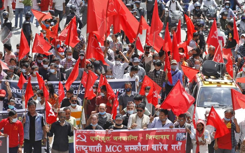 काठमाडौं,२८ भदौ । अमेरिकी सहयोग परियोजना मिलेनियम च्यालेन्ज कर्पोरेसन (एमसीसी) सम्झौताको विरोधमा नेकपा विप्लव समूहले काठमाडौंमा प्रदर्शन गरेको छ । सोमबार माइतीघरमा भएको प्रदर्शनमा महासचिव नेत्रविक्रम चन्द विप्लव, नेताहरु खड्गबहादुर विश्वकर्मा, हेमन्तप्रकाश वलीलगायतका नेताहरु पनि सहभागी भएका छन् । सडक र विद्युत प्रशारण लाइन निर्माणका लागि अमेरिकाले ५०० मिलियन डलर अनुदान दिन नेपाल सरकारसँग सन्