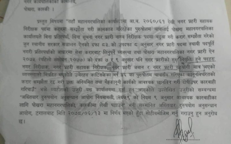पोखरा महानगरपालिकामा चरम बेथिति, अख्तियारले डामेका अस्थायी करार कर्मचारीलाई धमाधम बढुवा र स्थायी गर्ने तयारी